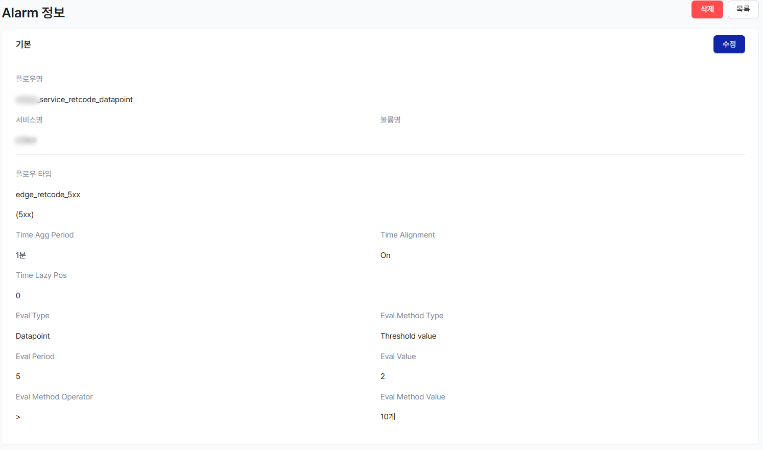Edge Retcode 5xx를 1분간 Agg한 데이터를 평가 하며, 평가 기준은 10개 이고, 평가 시간 총 5 Tick(5분) 동안에 2 Tick(2회) 이상 평가 기준을 초과 하면 Alarm 발생