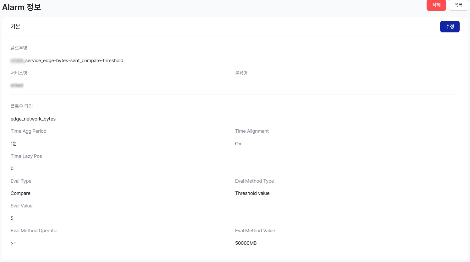 Network Bytes (전송량)이 1분 동안 Agg 된 값이 기준 시간으로부터 5분 전과 비교하여 50G 이상 증가한 경우 Alarm 발생