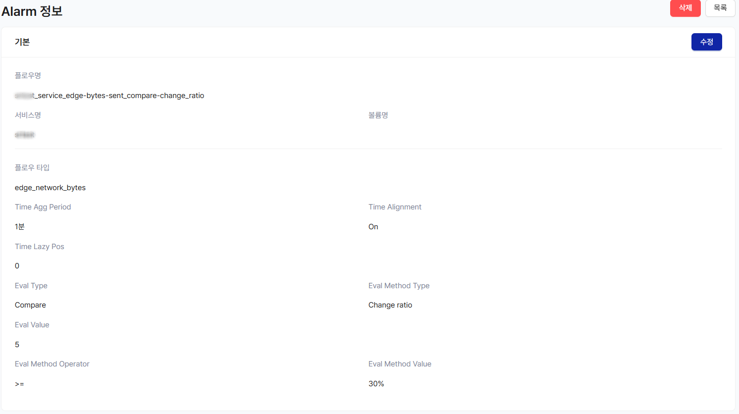 Network Bytes (전송량)이 1분 동안 Agg 된 값이 기준 시간으로부터 5분 전과 비교하여 30% 이상 증가한 경우 Alarm 발생